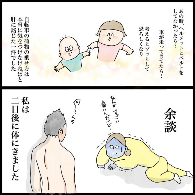 あわわ・・これは怖いですね。荷物が自転車の車輪に引っかかって転倒というのは私も経験がありますが、ガードレールに!?そんな危険もあるのですね(汗)誰も大怪我することがなくて本当に良かったです!ヘルメットとベルトがいかに重要かを強く感じました。