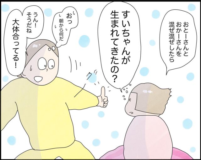 7歳長男レンくん、5歳長女すいちゃん、2歳次男ヨウちゃん、3人のお子さんのママであるhanemi(@hanma_ma)さんから、すいちゃんに突然質問された時のお話です。朝起きてすぐの質問が・・一気に目が覚めますね・・・