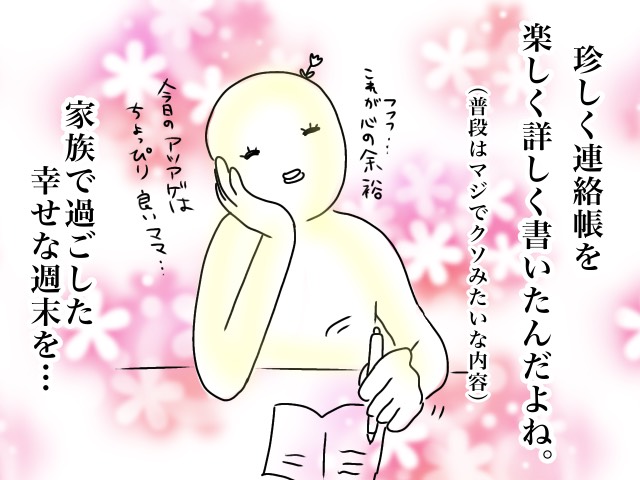 なんであるんだよ・・!心の余裕も笑顔も吹き飛びそうになった連絡帳の謎|アツアゲの育児絵日記 2024年06月24日 3歳のマチ子ちゃんのママであるアツアゲさんから、保育園の連絡帳のお話が届きました。ある日とても丁寧に連絡帳を書いたそうですが・・・。 丁寧に書き記した日に限って ねぇ、みんな。 こんな経験ない? ここまでは良い感じ! いや、本当なんであるんだよ。ここに。 アツアゲ 完全核家族で日々変態家族の日常をSNSで綴っています。 ———– こ、これも「心の余裕」で乗り切りましょう(笑) [ママ広場編集部] この記事をSHAREする この記事のカテゴリー マンガ子育て園児