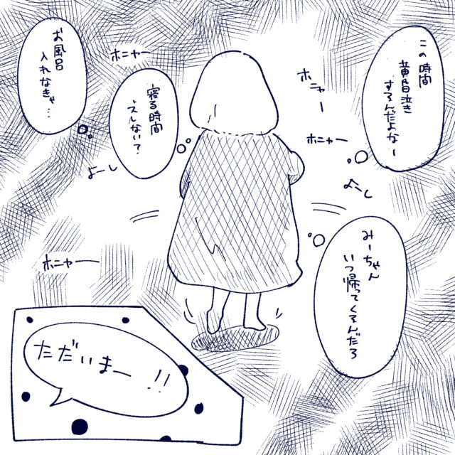 「みーちゃんいつ帰ってくるんだろう?寝る時間ズレないかな?・・お風呂入れなきゃ・・」