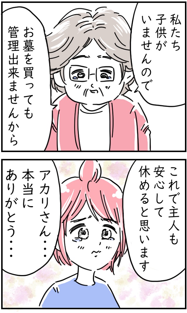 これで主人も安心して休めると思います。アカリさん・・本当にありがとう・・」
