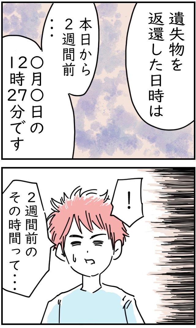「遺失物を返還した日時は本日から2週間前・・・〇月〇日の12時27分です。」