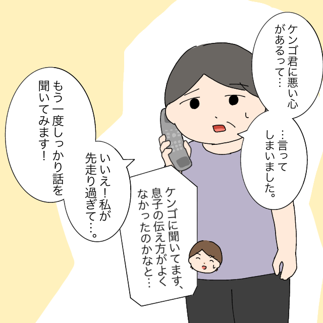 すると、「ケンゴ君に、『悪い心がある』って・・言ってしまいました」吉村先生の言葉に、「ケンゴに聞いてます、息子の伝え方がよくなかったのかなと・・」あかねさんが答えると「いいえ!私が先走り過ぎて・・。もう一度しっかり話を聞いてみます!」吉村先生が申し訳なさそうに言いました。