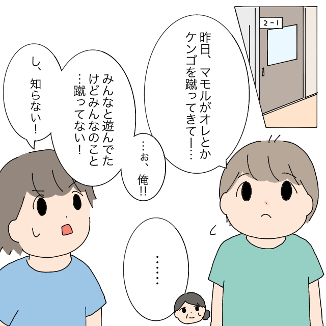 そしてまた子ども達に話を聞くことに。「昨日、マモルがオレとかケンゴを蹴ってきてー・・・」とヒロ君。「・・ぉ、俺!!みんなと遊んでたけどみんなのこと・・蹴ってない!し、知らない!」と言うマモル君。2人の話を聞いて「・・・」吉村先生は言葉を失ってしまいました。