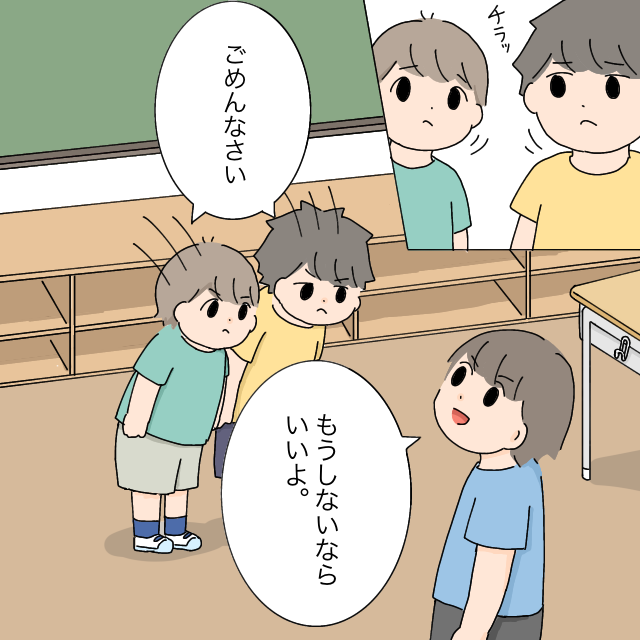 先生の言葉を聞いたケンゴ君がヒロ君の方をチラッと見て、それに気づいたヒロ君がケンゴ君の隣にやって来て、2人並んで「ごめんなさい」とマモル君に誤りました。それを見たマモル君は、「もうしないならいいよ」と2人を許したのでした。