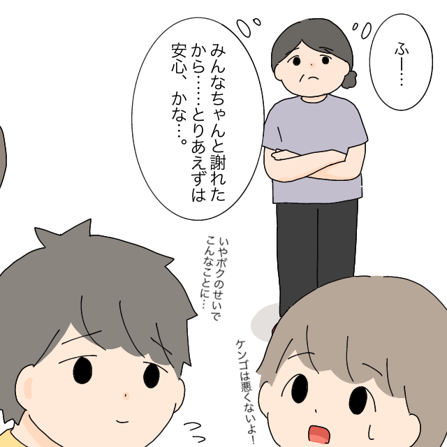 「ケンゴは悪くないよー」「いや、ボクのせいでこんなことに・・」ケンゴ君とヒロ君が話しているのを見て、「ふー・・・みんなちゃんと謝れたから・・とりあえずは安心、かな・・」吉村先生はそう思っていました。
