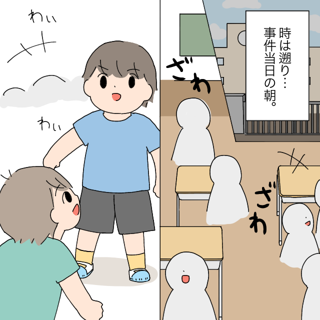 時は遡って、事件当日の朝のこと。教室の中は雑談する児童たちでかなりにぎやかな様子。そんななか、マモル君とヒロ君が一緒に遊んでいました。