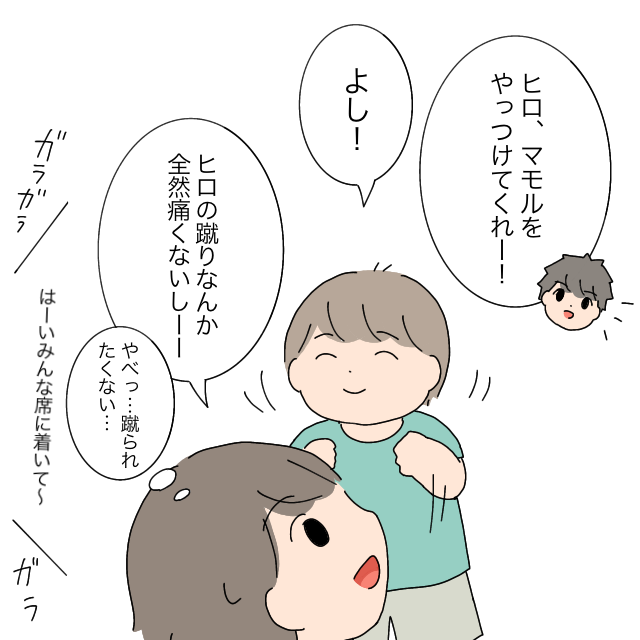 すると、「ヒロ、マモルをやっつけてくれー!」ケンゴ君がヒロ君にそう言うと、「よし!」とマモル君に向かうヒロ君。「ヒロの蹴りなんか全然痛くないしーー」と言いながら、マモル君は「やべっ・・蹴られたくない」と思っていました。そんな時、「はーいみんな席に着いて~」とドアを開けて吉村先生が入って来ました。