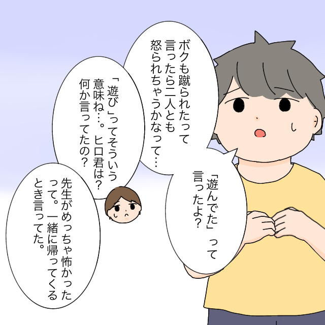 「『遊んでた』って言ったよ?ボクも蹴られたって言ったら、2人とも怒られちゃうかなって・・」と困った顔で言うケンゴ君。あかねさんが、「『遊び』ってそういう意味ね・・。ヒロ君は?何か言ってたの?」と言うと、「先生がめっちゃ怖かったって。一緒に帰ってくるとき言ってた」とケンゴ君が言いました。