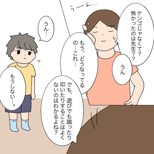 「ケンゴじゃなくて?怖かったのは先生??」「うん」そう言った後、「もおう、どうなってるの・・これ・・」と考え込むあかねさん、「でも、遊びでも蹴ったり叩いたりすることはよくないのはわかるよね?」ケンゴ君にそう言うと、「うん・・もうしない・・」反省した様子でそう言いました。