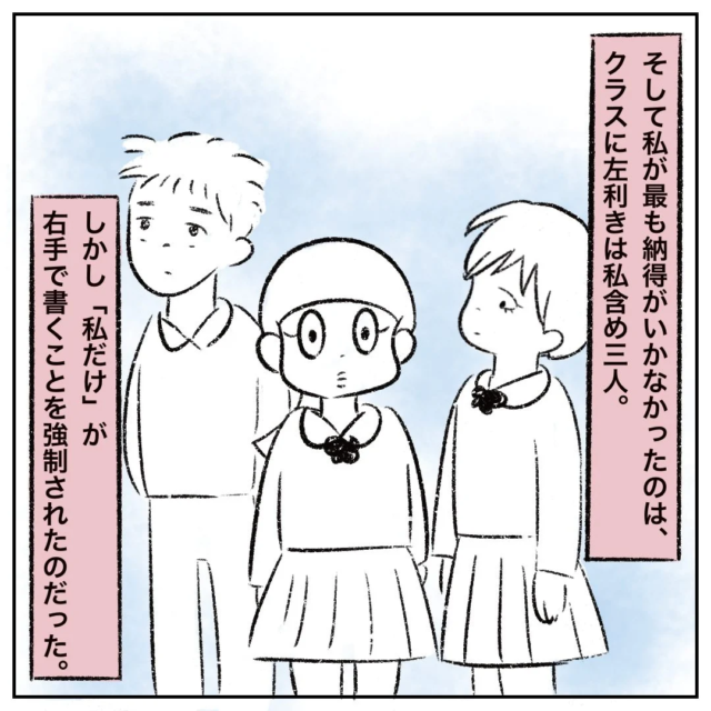 理不尽な先生の対応に納得がいかなかったまるさんですが、「なんで私だけ?」と先生に言えば他の2人も右手で書かされてしまうと思い言えませんでした。