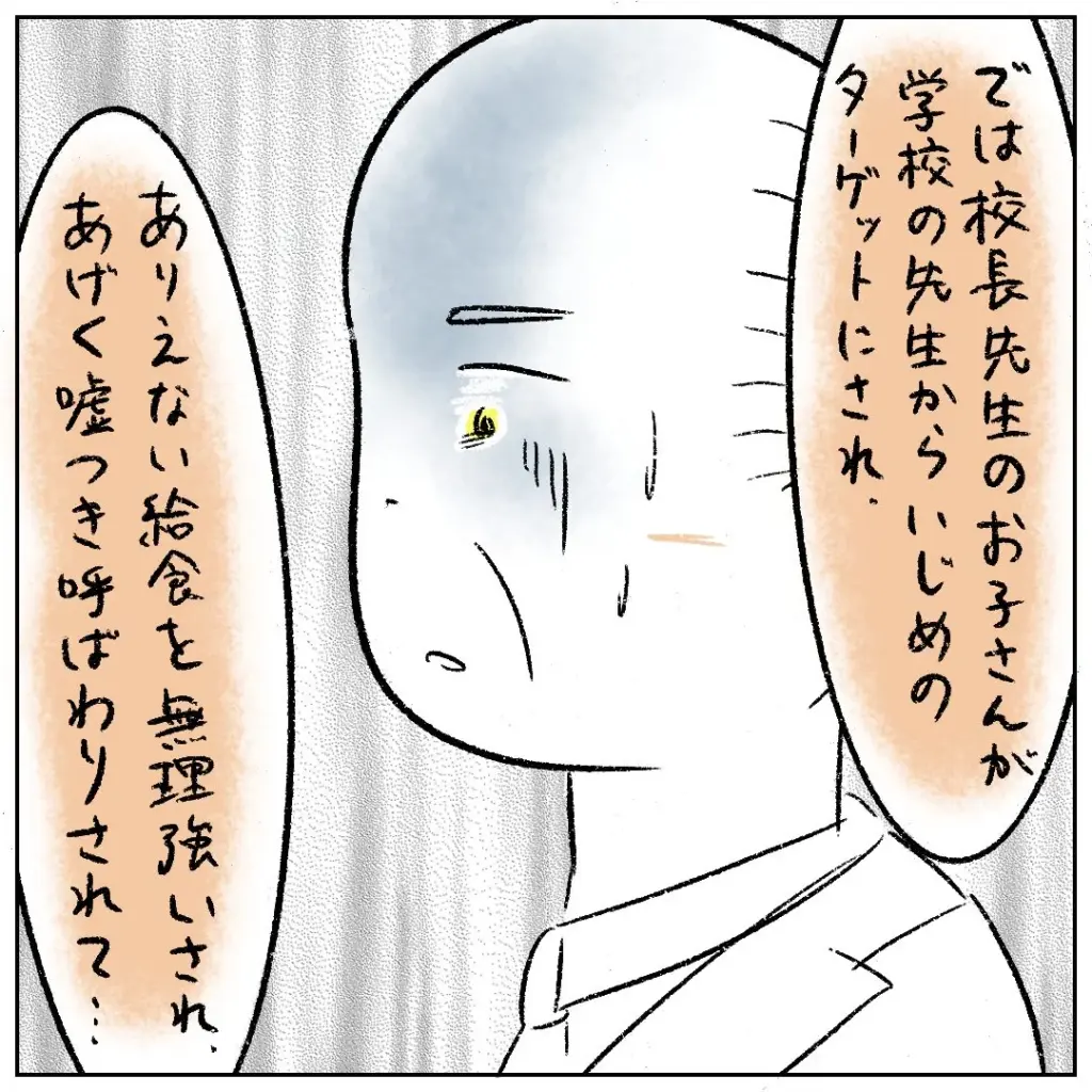 お母さんが「では校長先生のお子さんが学校の先生からいじめのターゲットにされ、ありえない給食を無理強いされ、あげく嘘つき呼ばわりされて・・」と立場を置き換えて話すと、校長先生の表情がみるみる青ざめます。
