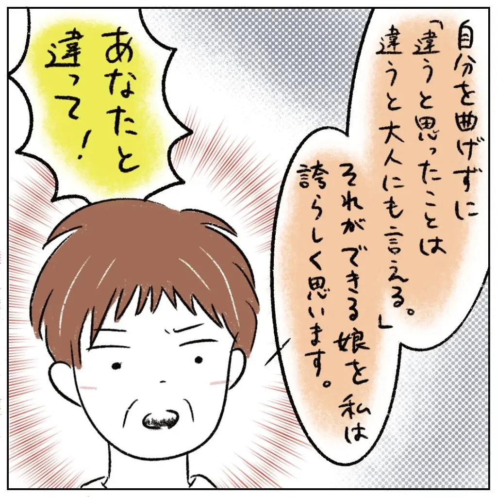 「自分を曲げずに『違うと思ったことは違うと大人にも言える。』それができる娘を私は誇らしく思います。あなたと違って!」と胸を張って言いました。