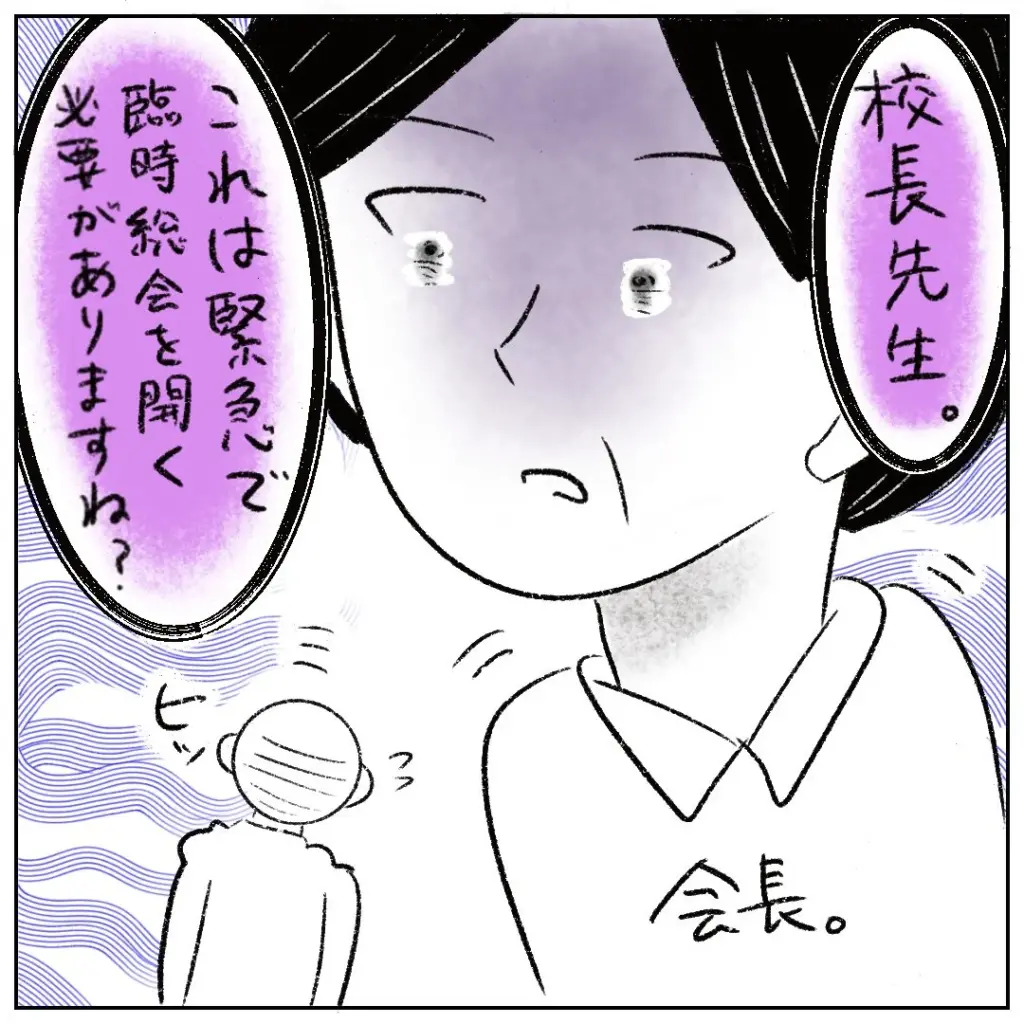 そして、校長先生の方を向くと「校長先生。これは緊急で臨時総会を開く必要がありますね?」と確認。PTA会長の圧に校長先生は小さくなってタジタジです。