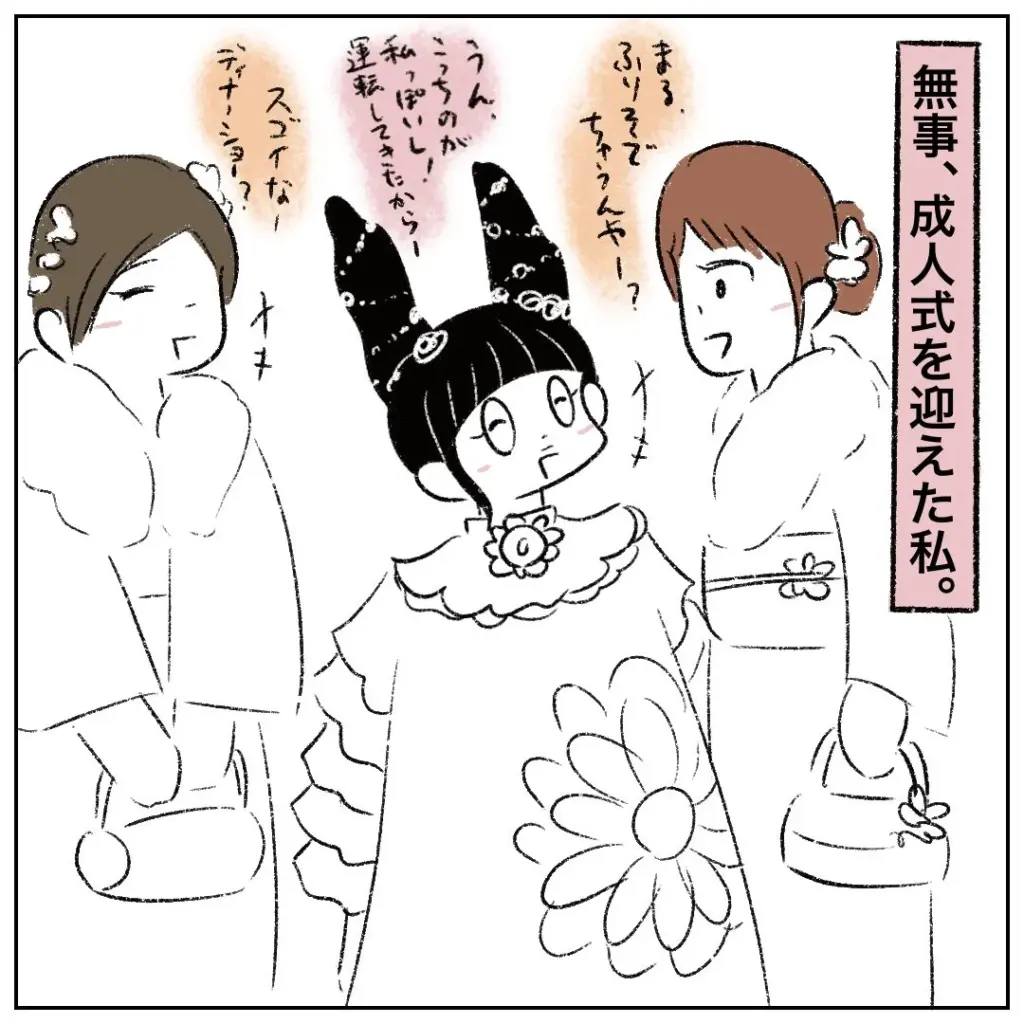 性根先生からいじめを受けた辛い体験を忘れることはありませんでしたが、まるさんは明るく育ち二十歳になり、無事に成人式を迎えました。式典の会場では久しぶりに会う友人たちと楽しい時間を過ごしていました。