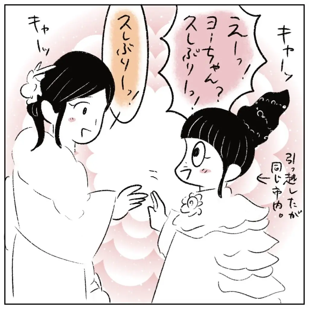 まるさんに声をかけたのは、引っ越し前の学校で仲良しだったヨーちゃんでした。久々の再会に「えーっ!ヨーちゃん?久しぶりーっ!」「久しぶりーっ!」とお互いに大喜びでテンションが上がる二人。