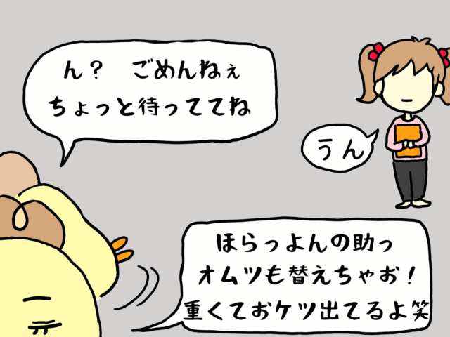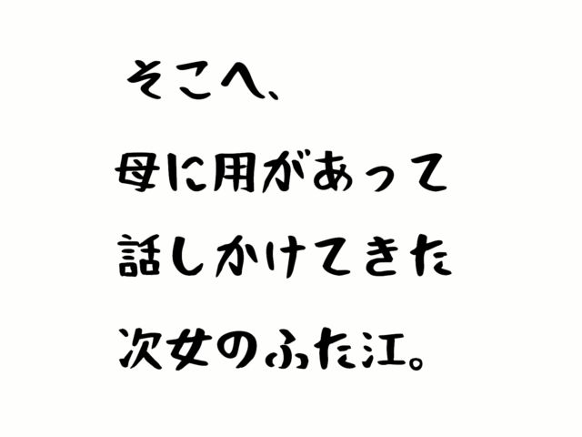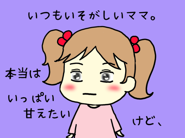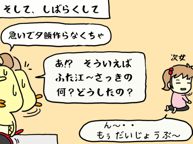 次女ふた江ちゃんはあまり人前で泣いたり甘えたりしない子なのですが、ある日、ふた江ちゃんがてる子さんになにかを言いたそうにやってきたものの、てる子さんの周りには他のきょうだいがべったりくっついていて・・。ふた江ちゃんが言いかけた時、頭の上に乗っていた次男くんが転がり落ちて大惨事が・・!ふた江ちゃんは思っていたことを伝えられず、おもちゃを拾うのを手伝ってくれたのですが・・