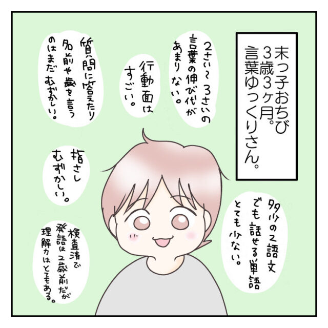 言葉の遅さを以前から感じていましたが、行動面がしっかりしていることなどから3歳まで様子を見ようと保健センターの心理士さんとずっと相談を重ねてきました。
