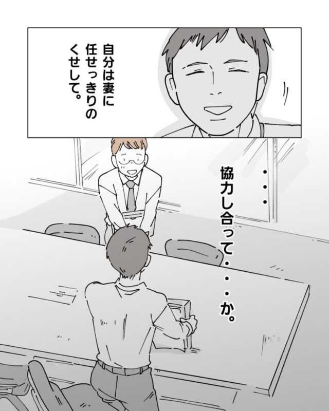「自分は妻に任せっきりのくせして」と自分を卑下しつつ、「協力し合って・・・か」と呟きました。