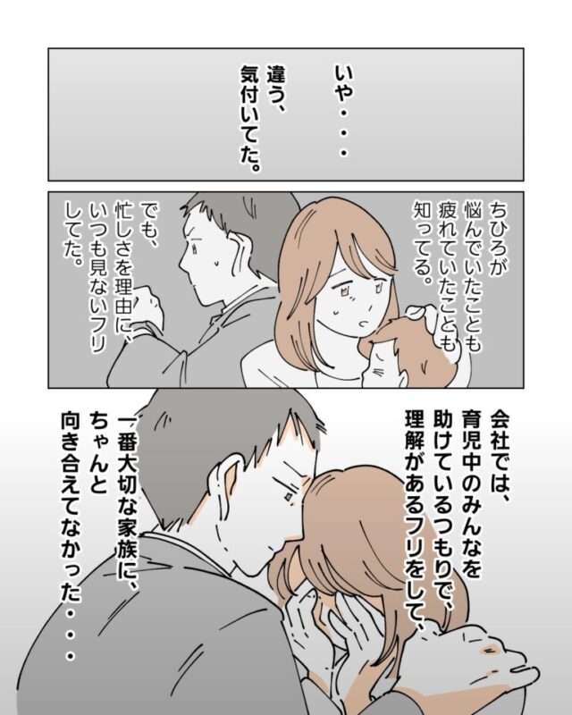 そして、「いや・・違う、気づいてた。ちひろが悩んでいたことも、疲れていたことも知ってる。でも、忙しさを理由に、いつも見ないフリしてた」さらに、「会社では、育児中のみんなを助けているつもりで、理解があるフリをして、一番大切な家族にちゃんと向き合えてなかった・・」良平さんの頭の中で、反省の想いがぐるぐると巡っていました。