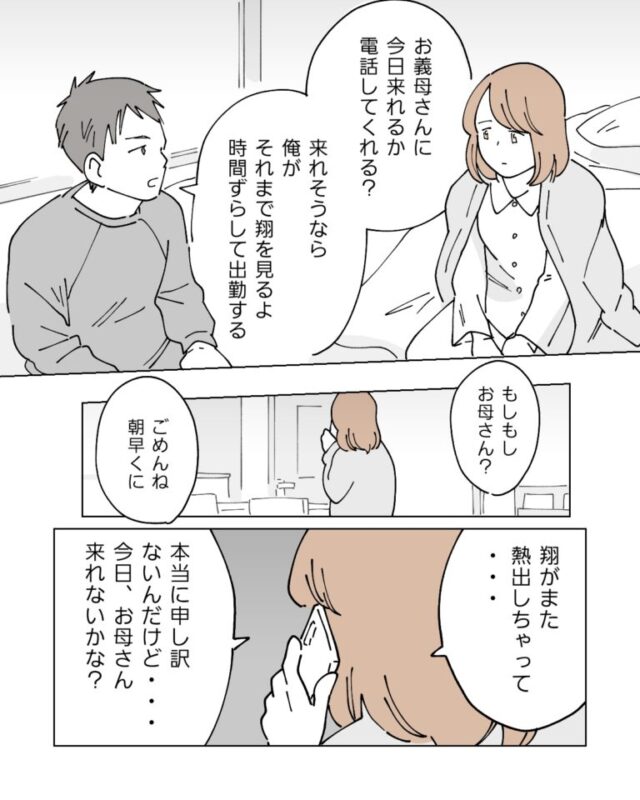 すると、「お義母さんに今日来てもらえるか電話してくれる?来られるなら俺がそれまで翔をみるよ。時間ずらして出勤するから」良平さんにそう言われ、ちひろさんはお母さんに電話することに。「もしもしお母さん?ごめんね朝早くに。翔がまた熱出しちゃって・・本当に申し訳ないんだけど・・今日、お母さん来られないかな?」ちひろさんはお母さんに電話をしてそう言いました。
