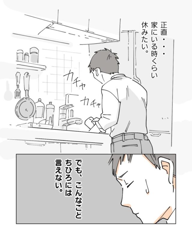 みんなより上の立場の俺が休むわけにはいかない、と昼ごはんも食べずに働いて帰ってきた良平さんは、「正直・・家にいる時くらい休みたい。でも、こんなことちひろには言えない」と心の中で呟きました。