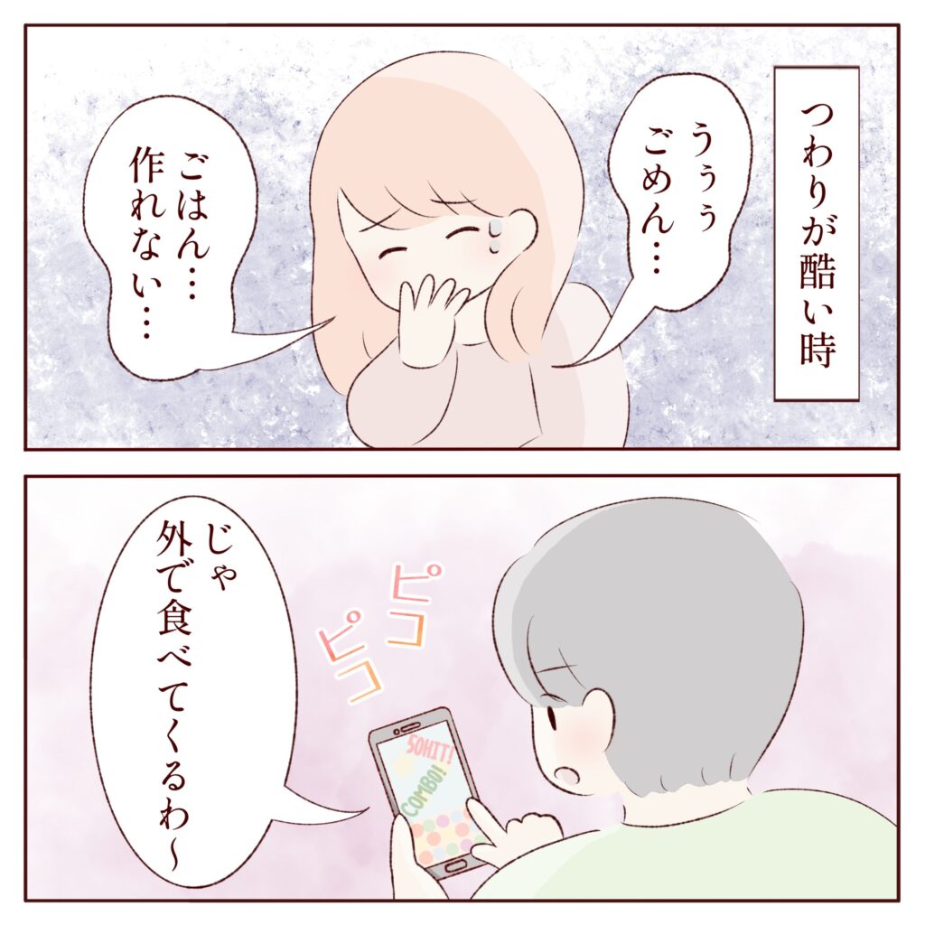 「うぅぅ・・ごめん・・ごはん作れない・・」辛くてうめきながらそう言うと、「じゃ、外で食べてくるわ!」そう言いながらもスマホに夢中の夫。