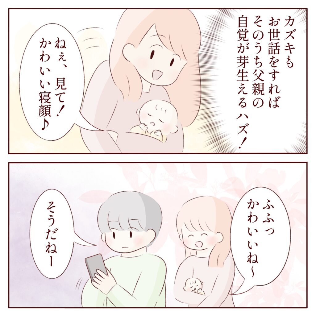 それでも、カズキも自分の娘のお世話をすれば父親の自覚が芽生えるはずと思っていた私は、ことあるごとに「ねぇ見て!可愛い寝顔」「かわいいね」とツバサの様子をカズキに見せましたが、カズキは「そうだねー」と上の空。スマホゲームの方が大切なのか、こちらをチラリとも見ることはありませんでした。