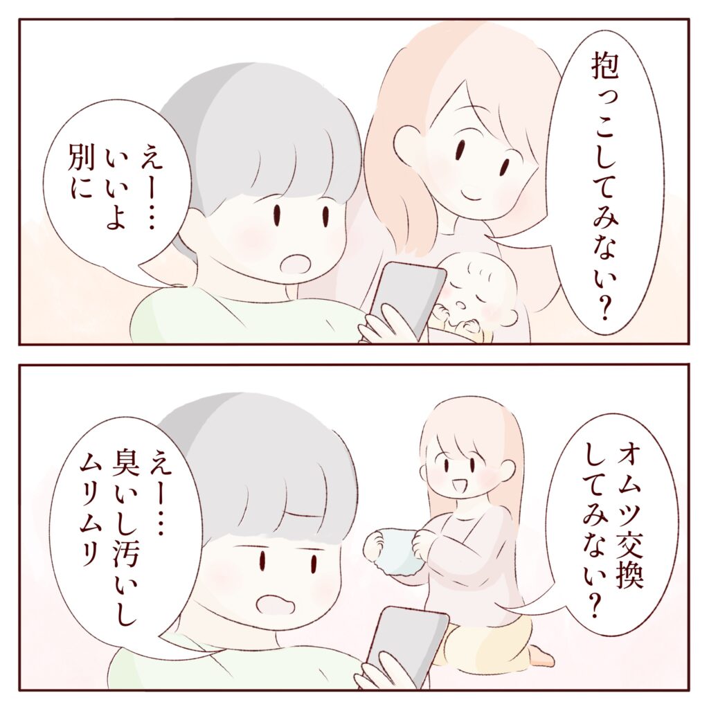 「抱っこしてみない?」「オムツ交換してみない?」と、私は根気よくカズキの視線をツバサに向けさせようと頑張っていました。でもそのたびに「えー、いいよ別に。」「えー、臭いし汚いしムリムリ」と、カズキはどんな時でもスマホから目を離すことはありませんでした。