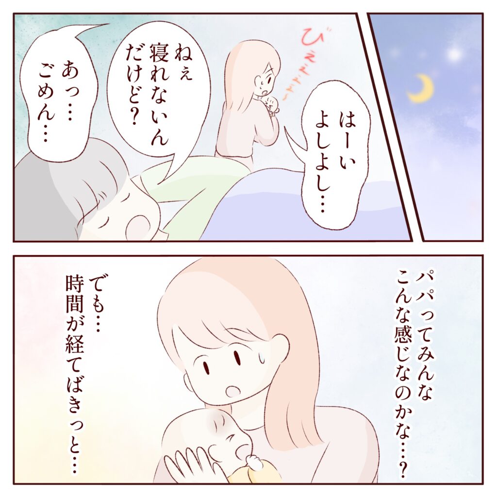 ツバサが夜泣きで必死にあやす私にカズキは「ねぇ、寝れないんだけど?」と不機嫌そうな顔でひと言。父親との記憶があまりなく、男兄弟もいない私は、そんなカズキにパパってみんなこんな感じなのかな?と思っていました。それでも、時間が経てばきっとカズキも変わると希望すら抱いていたのです。