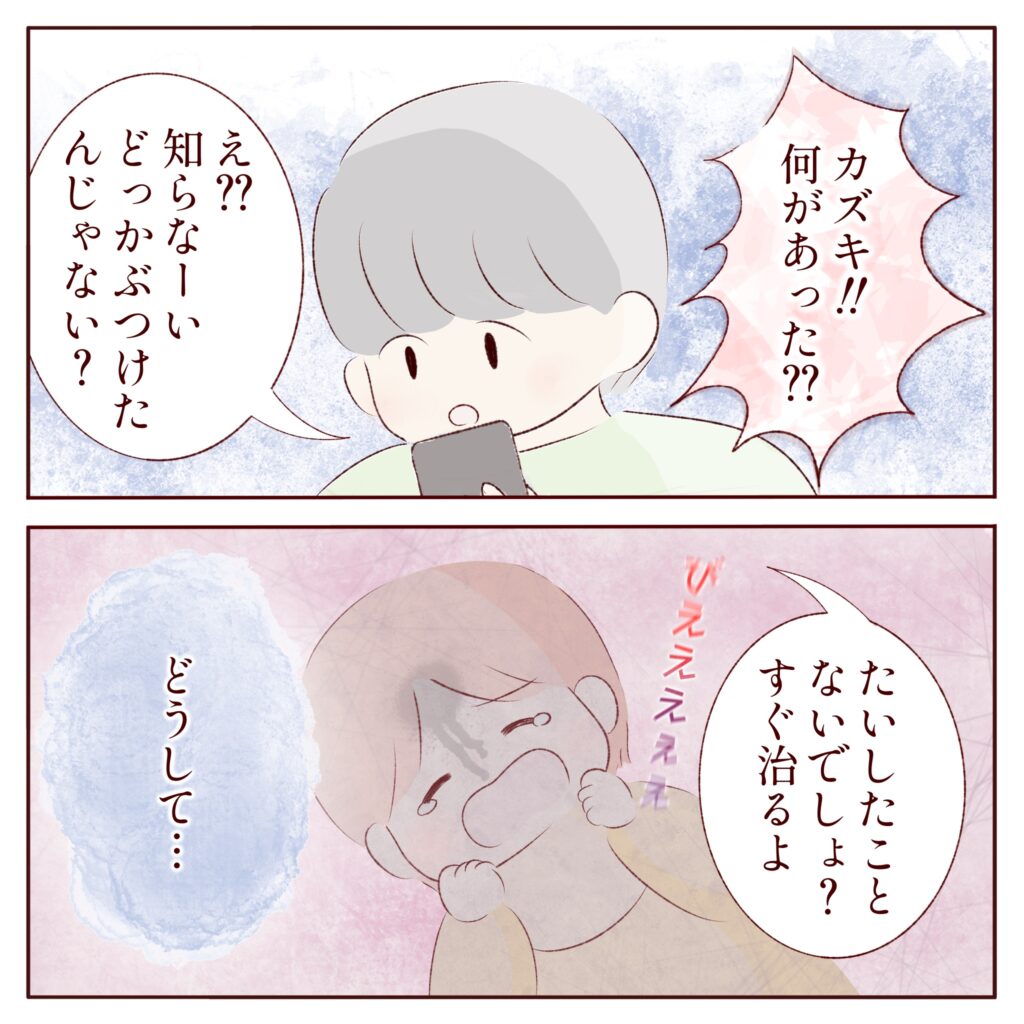 リビングに向か合うとツバサの「わーーーーん!!」と大きな泣き声が聞こえてきて慌てて「どうしたの!?」と駆けつけました。ツバサをみるとおでこをケガしていました。私は驚いて「えっ!?血が出てるじゃない!!」と言いました。