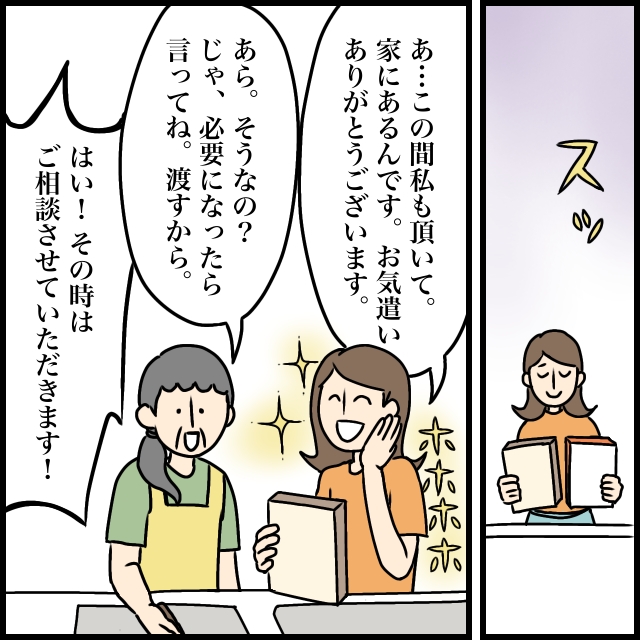 驚きつつも呼吸を整えた私は、「あ・・この間私もいただいて。家にあるんです。お気遣いありがとうございます。ホホホホ」と言うと、「あら、そうなの?じゃ、必要になったら言ってね。渡すから」義母にそう言われ、「はい!その時はご相談させていただきます!」そう言ってなんとかその場を回避したのでした。