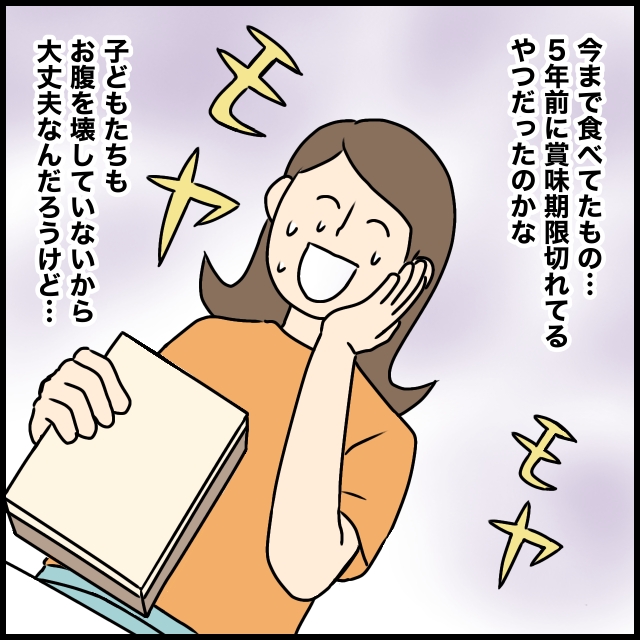 でも、「今まで食べてたもの・・5年前に賞味期限切れてるやつだったのかな。子どもたちもお腹を壊していないから大丈夫なんだろうけど・・」と笑顔を作りつつもモヤモヤが止まりません。