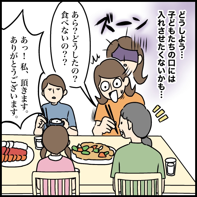 「どうしよう・・子どもたちの口には入れさせたくないかも・・」そう考えていると、「あら?どうしたの?食べないの?」義母にそう言われ、「あっ!私いただきます。ありがとうございます」と慌てて返事をすることも。