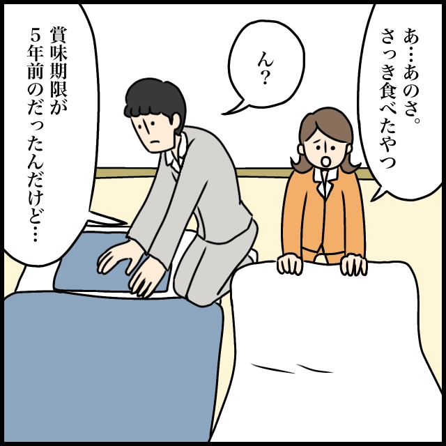 そして夜になり、「あ・・あのさ。さっき食べたやつ」そう言うと、「ん?」と返事をするジュンペイに、「賞味期限が5年前のだったんだけど・・」と打ち明けたのでした。