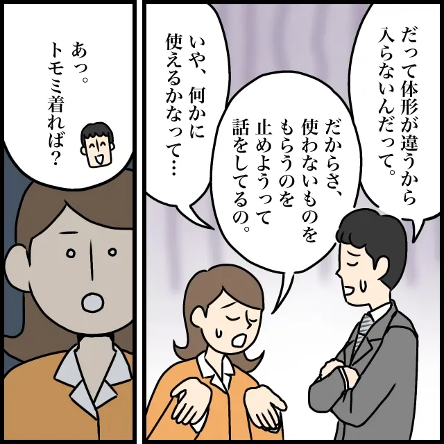 「だって体形が違うから入らないんだって」と、ジュンペイは言い訳をします。私は「だからさ、使わないものをもらうのを止めようって話をしてるの」と伝えますが、「いや何かに使えるかなって・・・」と引き下がる様子はありません。そしてしばらく考え込んだ後「あっ、トモミ着れば?」と謎の提案をしてきました。