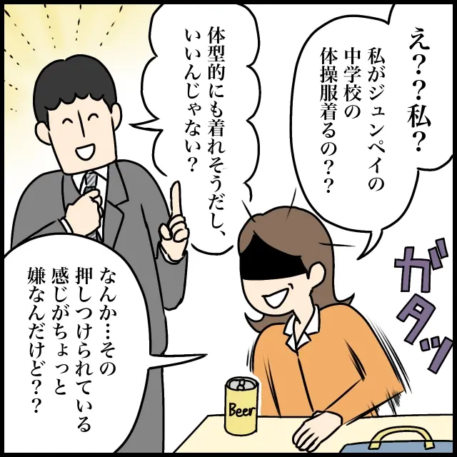 「え?私がジュンペイの中学校の体操服着るの?」驚きのあまり、私は思わず身を乗り出しました。「体系的にも着れそうだし、いいんじゃない?」笑顔で話すジュンペイに、「押し付けられている感じがちょっと嫌なんだけど?」と顔を引きつらせながら言います。