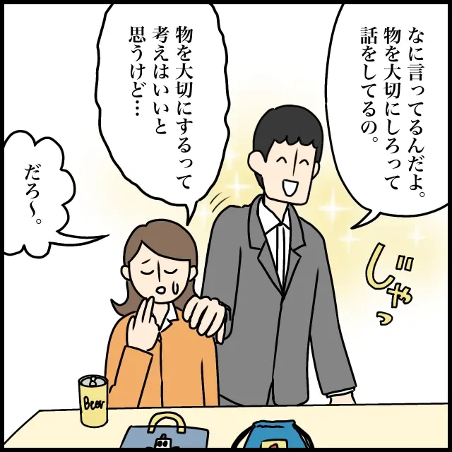 ジュンペイはキラキラとした笑顔で、「なに言ってるんだよ、物を大切にしろって話をしてるの」と話しながら、私の肩をポンと叩きました。「物を大切にするって考えはいいと思うけど・・・」私はなんだかうまく言いくるめられた気がして、釈然としませんでした。
