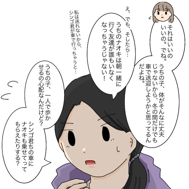ナオキくんママの様子を怪訝に思いながら「それはいいのいいの。でね。うちの子、体がそんなに丈夫じゃないから、冬の間だけでも車で送迎しようかと思ってるんだよね」と伝えると、「え、でも、そしたら・・・うちのナオキは朝一緒に行く友達が誰もいなくなっちゃうじゃない!私は送れないから、シンゴ君が車で行っちゃうと・・・うちの子、一人で歩かせるの心配なんだけど?シンゴ君ちの車にナオキも乗せてってもらえたりする?」と我が子のことしか頭にないナオキくんママは一人でペラペラと話し続けます。
