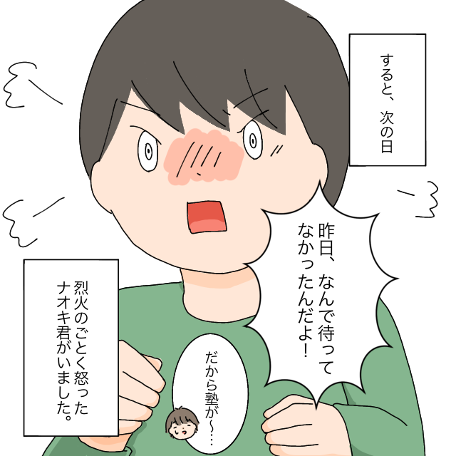 すると次の日。「昨日なんで待ってなかったんだよ!」と怒鳴り出すナオキくん。「だから塾が~・・」とシンゴくんが言うのも聞かず、烈火のごとく怒り出したのでした。
