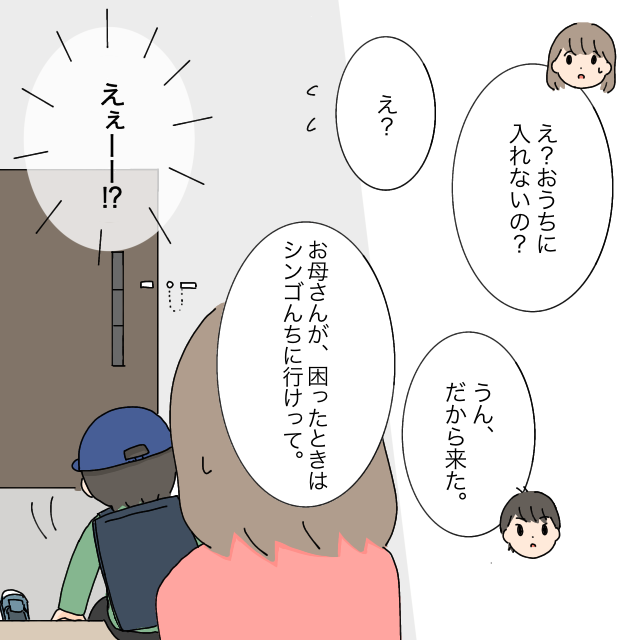 「え?おうちに入れないの?」そうたずねると「うん、だから来た」と答えるナオキくんに「え?」とまたしても驚くママ。すると、「お母さんが、困ったときはシンゴんちに行けって」と言いながら、ナオキくんはサッサと靴を脱ぎ家に入ろうとしていました。