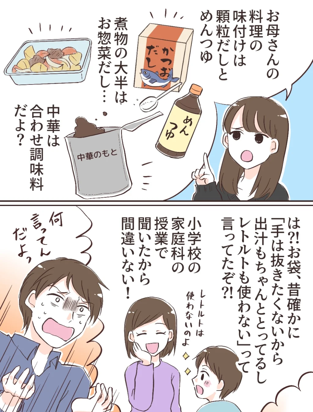 みのりちゃんは「お母さんの味付けは顆粒だしとめんつゆ、煮物の大半はお惣菜だし、中華は合わせ調味料だよ?」と、義母の味のからくりを種明かし。しかし充は信じられないといった表情で「お袋は昔、手は抜きたくないから出汁をとるし、レトルトは使わないって言ってたぞ!?」と真っ向から否定します。