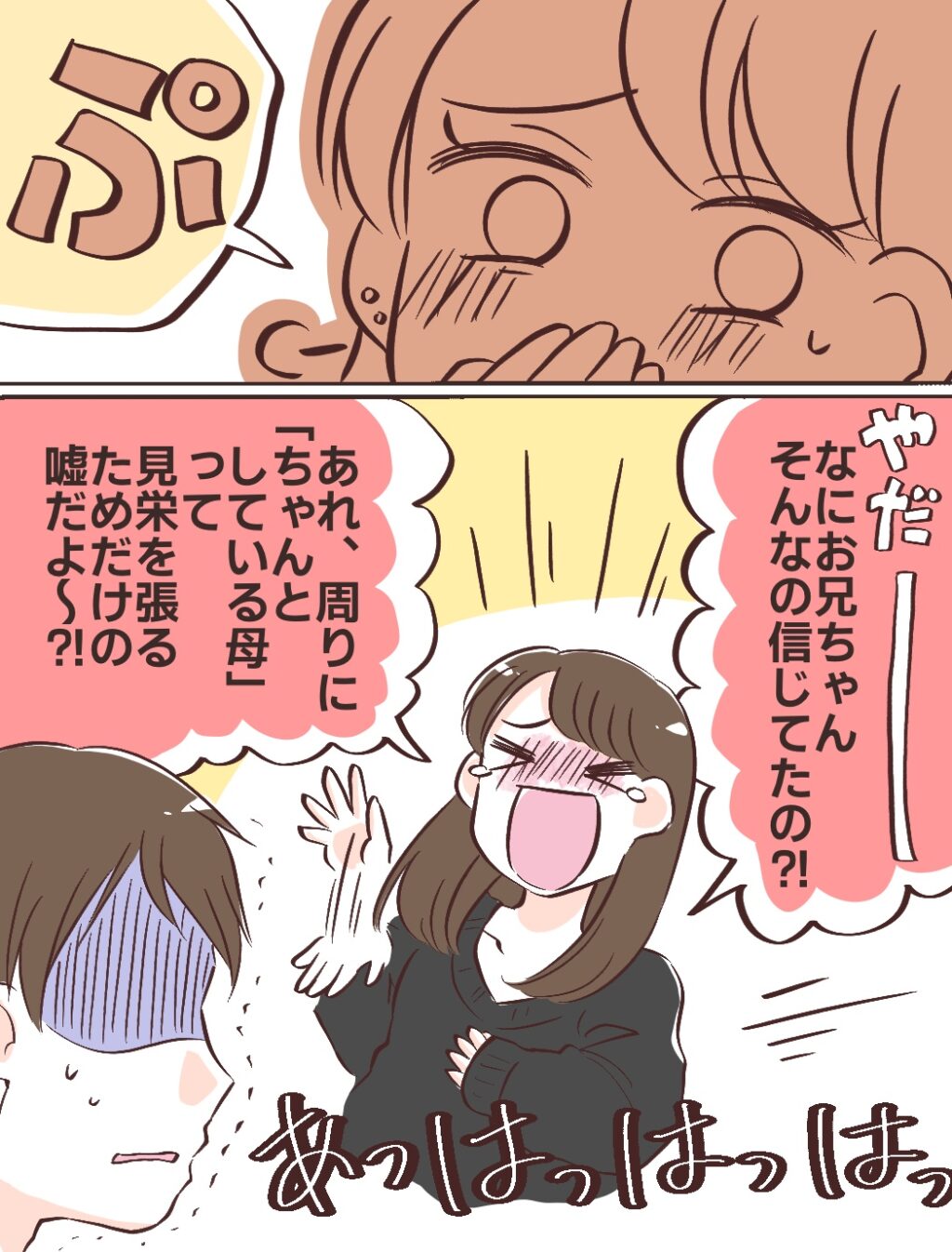 みのりちゃんは、充の必死の訴えに思わず吹き出します。「やだー!お兄ちゃんそんなの信じてたの!?あれ、周りに『ちゃんとしている母』って見栄を張るためだけの嘘だよ~!?」とお腹を抱えて大笑い。長年信じてきた事実があっけなく崩れ去り、充は言葉を失ったまま、わなわなと震えました。