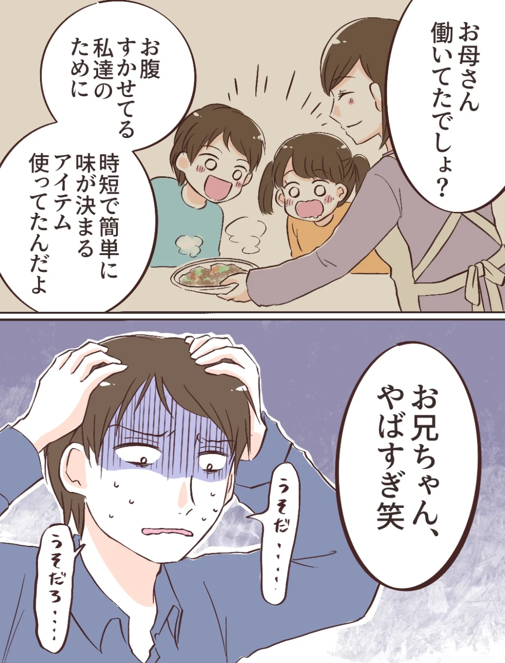 実は、働きながら子育てをしていた義母は、お腹を空かせた子どもたちのために、時短で簡単に味が決まるアイテムを使っていたのでした。それを知った充は「うそだ・・・」と頭を抱えます。