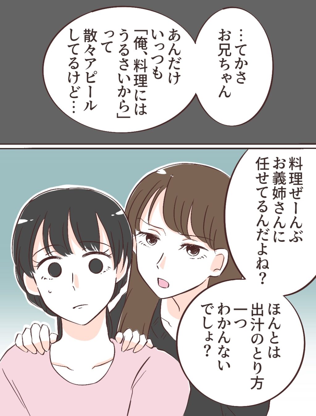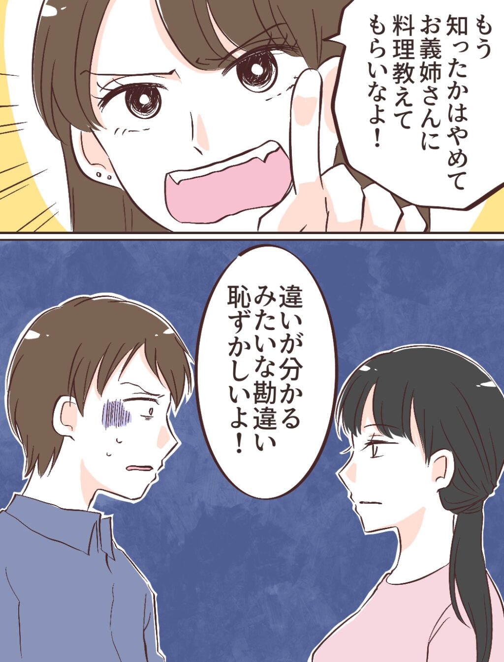 そして充を鋭い目つきでにらみつけると「もう知ったかはやめてお義姉さんに料理教えてもらいなよ!違いが分かるみたいな勘違い、恥ずかしいよ!」とキッパリ言い放ったのでした。