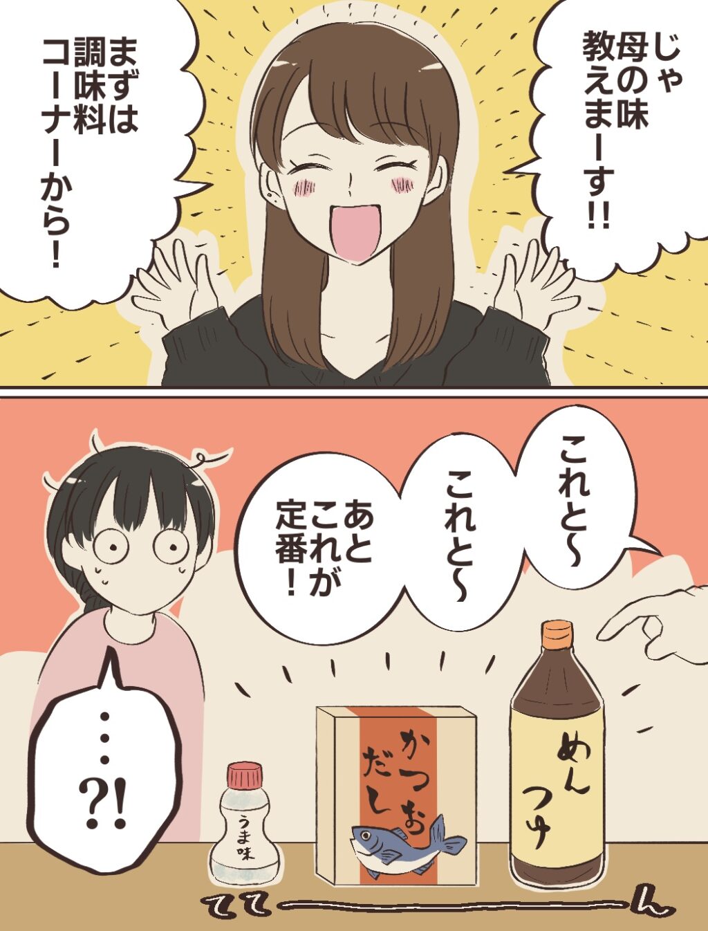 みのりちゃんは、買い物から帰るなり「じゃ、母の味教えまーす!」と元気いっぱいに宣言して、机の上に見覚えのある調味料を次々と並べ始めます。そして「まずは調味料コーナーから!」と言うと、めんつゆ、かつおだし、うま味調味料が定番の味付けだと教えてくれました。