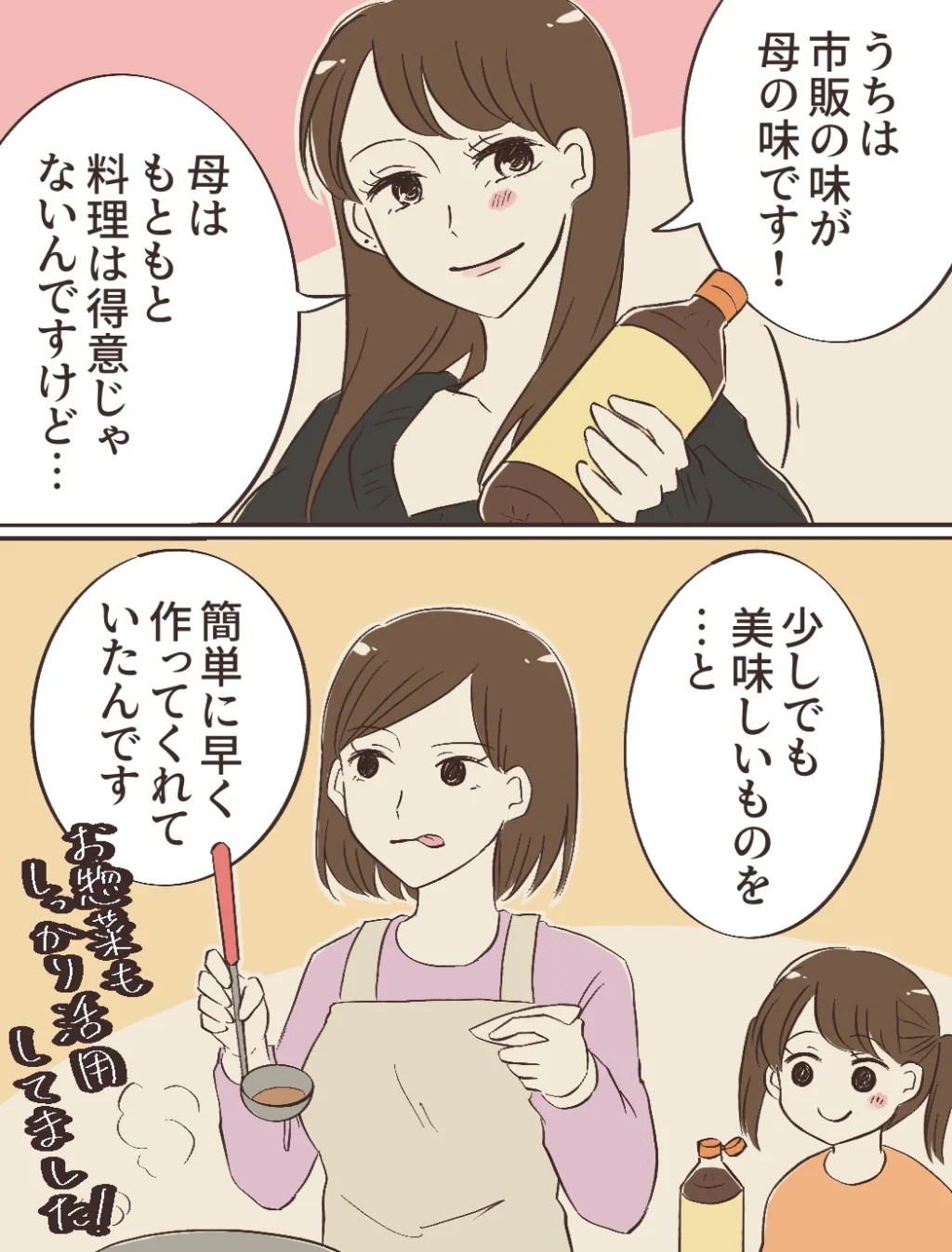 私が目を丸くしていると、みのりちゃんはニコッと笑って「うちは市販の味が母の味です!母はもともと料理は得意じゃないんですけど・・・少しでも美味しいものを、簡単に早く作ってくれていたんです」と話してくれました。