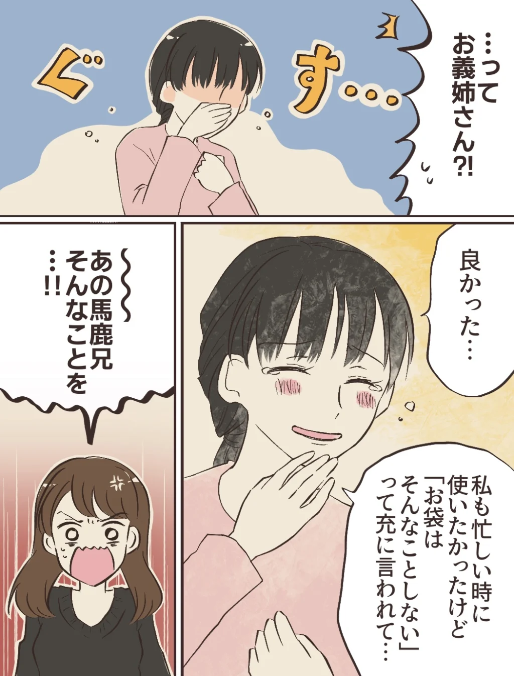みのりちゃんの話を聞いた瞬間、私は張りつめていた糸が切れたように泣き出してしまいました。「良かった・・・私も忙しい時に使いたかったけど『お袋はそんなことしない』って充に言われて」そう言って笑うと、みのりちゃんは眉をつり上げて「あの馬鹿兄、そんなことを!」と、まるで自分のことのように怒ってくれました。