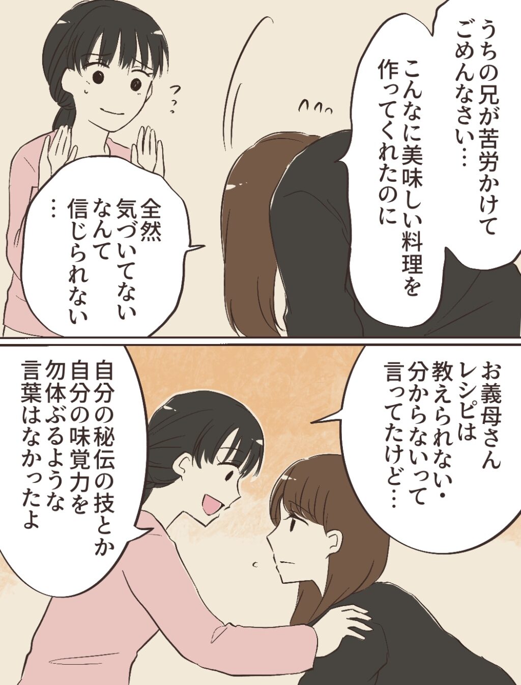 「うちの兄が苦労かけてごめんなさい・・・こんなに美味しい料理を作ってくれたのに、全然気づいてないなんて信じられない」そう言って、充の代わりに深々と頭を下げるみのりちゃん。私は彼女の肩にそっと手を置くと「お義母さん、レシピは教えられない分からないって言ってたけど、自分の秘伝の技とか味覚力を勿体ぶるような言葉はなかったよ」と声をかけました。