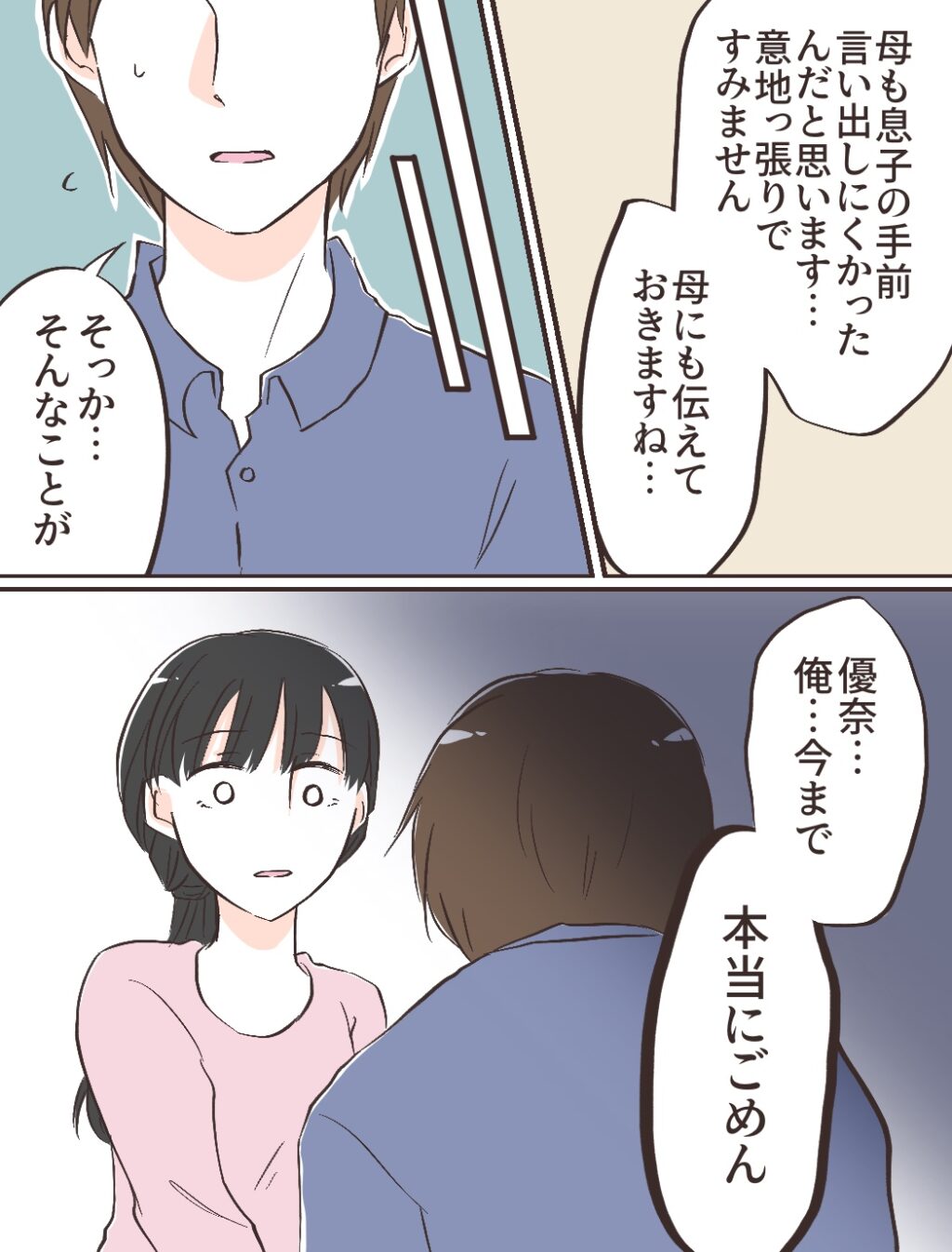 みのりちゃんは申し訳なさそうに、「母も息子の手前、言い出しにくかったんだと思います・・・意地っ張りですみません。母にも伝えておきますね」と言ってくれました。一連の出来事を充に話すと、彼は私の目をまっすぐ見つめて、「優奈・・・俺、今まで本当にごめん」と、はじめて謝ってくれました。
